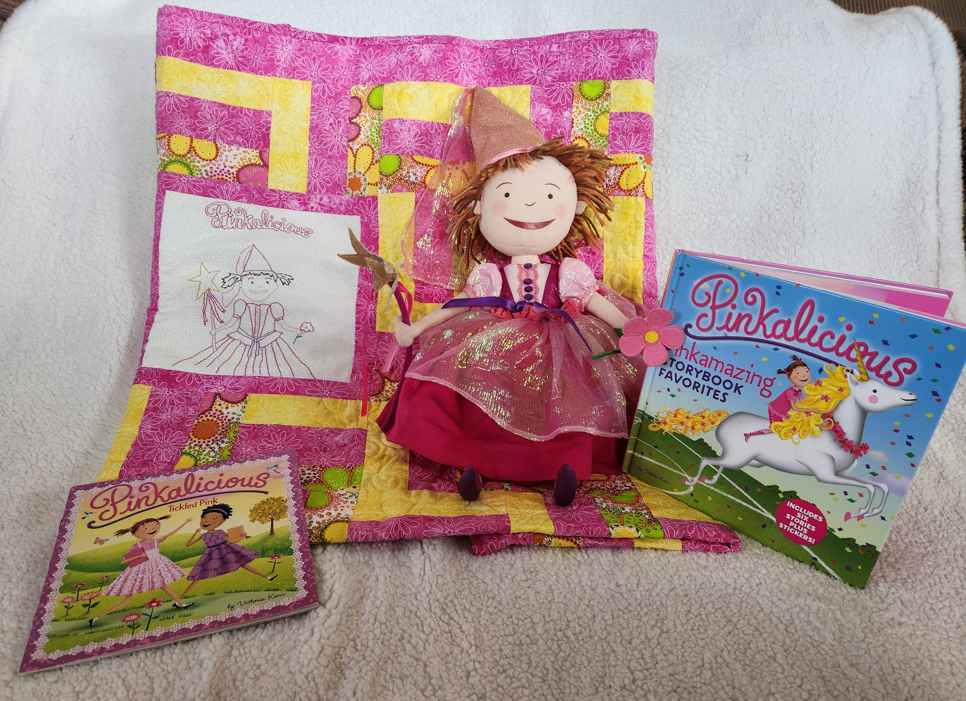 Any little one who loves Pinkalicious and pink will love to snuggle under this cozy Pinkalicious quilt and read her books. This quilt comes with the book "Pinkalicious, Tickled Pink" and Pinkalicious herself! This would make any little girl an amazing gift.