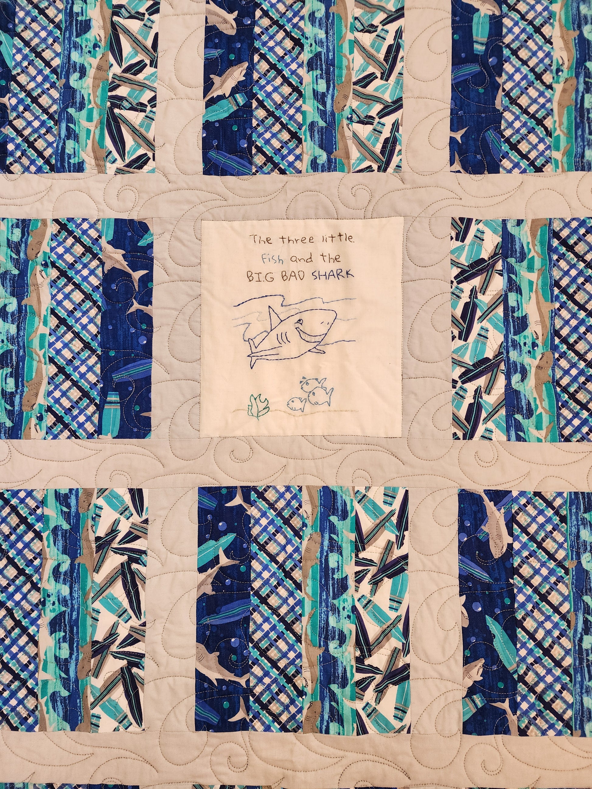 This shark quilt is full of adventures in the ocean. If your child loves the ocean and sharks they will love to snuggle with you in this cozy quilt and read the book “The Three Little Fish and The Big Bad Shark” and a matching pillow.